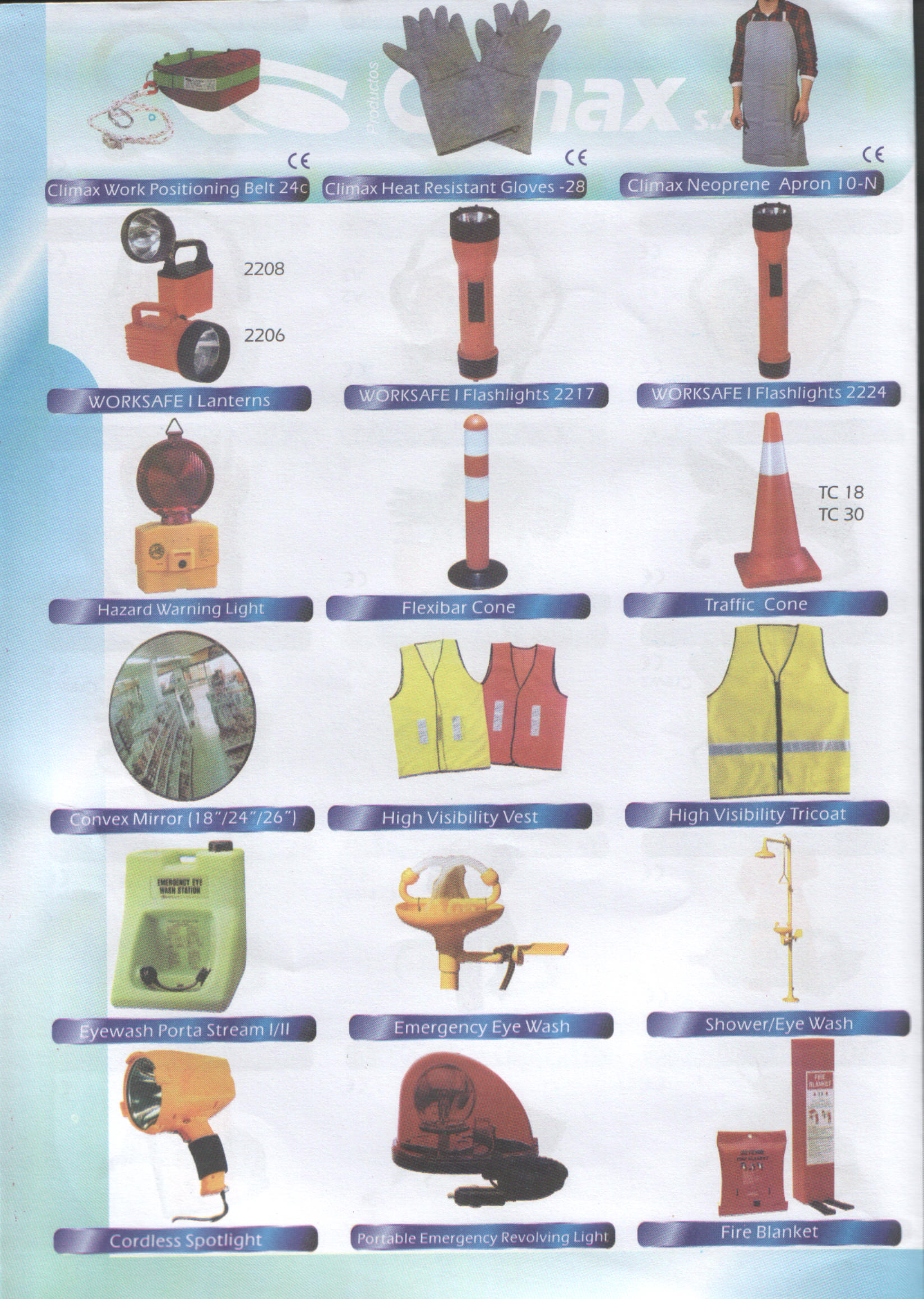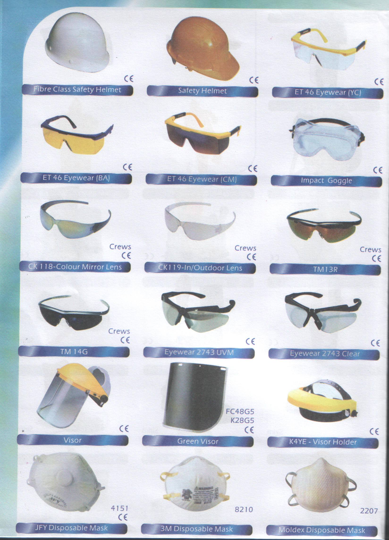 Safety Products : Absorbers, apron, chemical cartridge, disposable dust mask, disposable surgical mask, ear muff, earplug, full body harness, full face mask, goggles, half mask respirator, head cover, heat resistant gloves, latex gloves, nitrile gloves, polyamide lanyard, safety eyewear, safety footwear, safety helmet, shoe cover, visor and etc. |